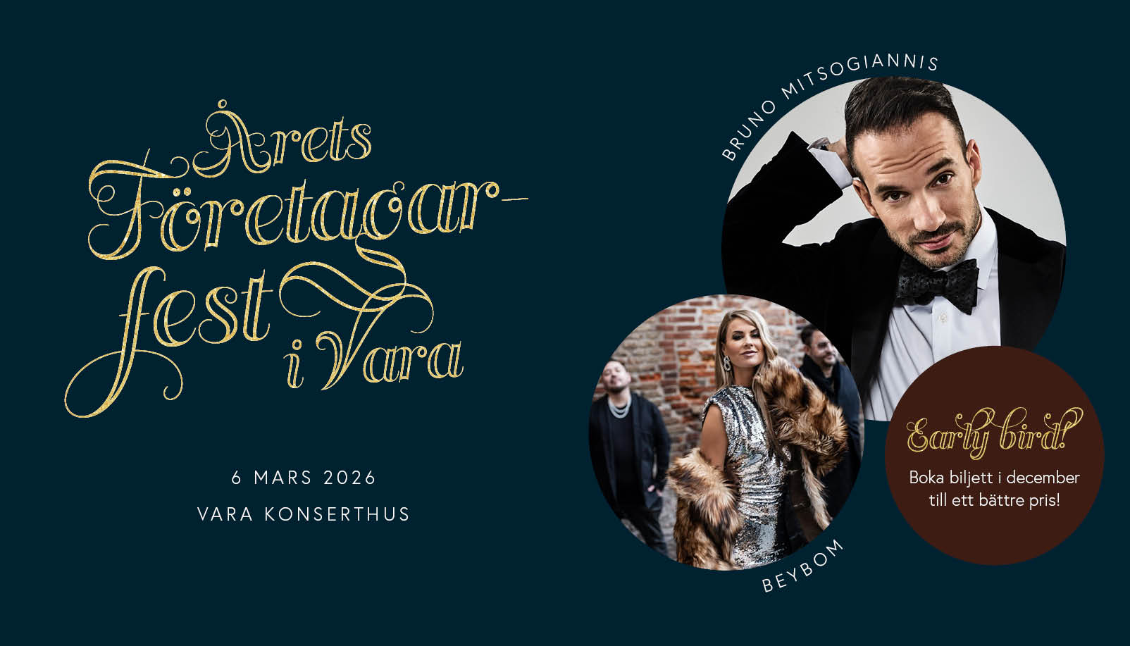 Boka din plats till Årets Företagarfest i Vara den 6 mars 2026 – en kväll fylld med prisutdelningar, trerättersmiddag och fantastisk underhållning av ... -